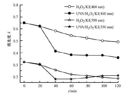 圖 4 UVA/H2O2/KI、H2O2/KI體系中反應液的A460 、A350變化