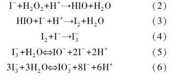圖 8為不同H2O2添加濃度下反應液的A350(即I3-)變化,H2O2添加濃度為10 mmol·L-1時,體系中產生大量I3-,這是因為H2O2添加濃度過低,氧化產生的有限I2會與大量剩余I-結合(式(4)),從而降低了I·的產生量,限制了磺胺嘧啶的降解(Hu et al.,2012;Yeo et al.,2009).增加H2O2添加濃度(10.0~120.0 mmol·L-1),體系中I2的產生量及碘自由基隨之增加,磺胺嘧啶的去除率明顯提高. 而繼續(xù)增加其添加濃度至180.0 mmol·L-1,由于中間氧化物HIO與過量H2O2反應(式(10)),使得體系中I3-產生量相對提高(Katsuzaki et al.,1972),因而一定程度上限制了磺胺嘧啶的降解.具體參見污水寶商城資料或http://www.dowater.com更多相關技術文檔。