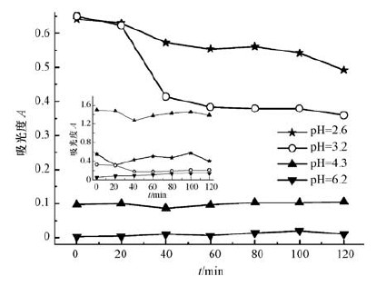 圖 6 不同pH值下反應液的A460變化(插圖為對應的A350變化)