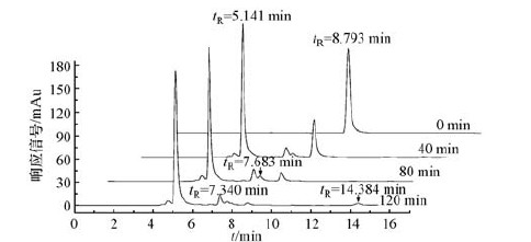 為研究UVA/H2O2/KI體系對磺胺嘧啶的降解情況,考察初始濃度為0.04 mmol·L-1的磺胺嘧啶溶液,在pH=3.2,H2O2、KI添加濃度分別為120.0、2.4 mmol·L-1條件下,UVA紫外輻射下磺胺嘧啶的HPLC譜圖變化,結果如圖 12所示.由圖 12可以看出,實驗條件下,磺胺嘧啶的保留時間tR=8.793 min,隨著反應的進行,其峰面積不斷減小,說明磺胺嘧啶得到了有效降解.體系中由于H2O2的加入,保留時間tR=5.141 min的物質產生,且在反應過程中其峰值幾乎保持不變.磺胺嘧啶降解過程中主要產生了3種中間產物,對應保留時間依次為7.340、7.683和14.384 min. 在此色譜條件下,磺胺標準樣品的保留時間tR=7.447 min,與7.340 min非常接近,因此,推斷磺胺為UVA/H2O2/KI體系降解磺胺嘧啶的產物之一,具體磺胺嘧啶的降解路徑有待進一步研究.