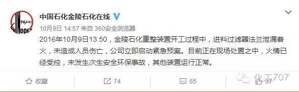 對此,中國石化集團金陵石油化工有限責任公司在其官方微博回應稱,爆燃原因系重整裝置開工過程中,進料過濾器法蘭泄漏著火所致,但未造成人員傷亡,目前正在現場處置之中,火情業已受控,未發生次生安全環保事故,而其他裝置則運行正常。