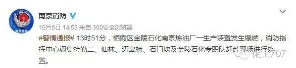 據江蘇省南京市公安消防局官方微博稱,10月9日13時51分,棲霞區金陵石化南京煉油廠一生產裝置發生爆燃。南京電視臺十八頻道官方微博亦報道稱:“網曝金陵石化煉油廠發生爆炸,堯化門上空黑煙籠罩”。
