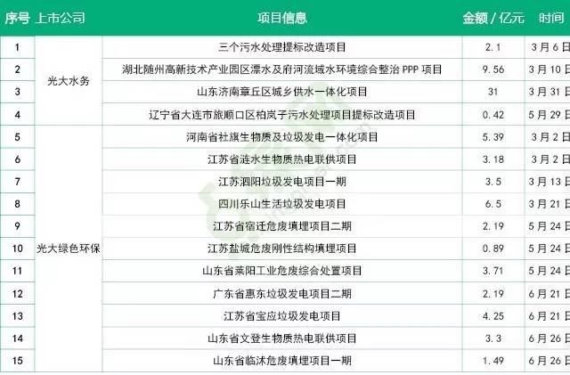 報(bào)告期內(nèi),光大綠色環(huán)保新取得了11個(gè)綠色環(huán)保項(xiàng)目,其中垃圾發(fā)電和危廢處置均為4個(gè),生物質(zhì)發(fā)電2個(gè),還有1個(gè)為生物質(zhì)及垃圾焚燒發(fā)電項(xiàng)目,涉及金額為36.59億元。