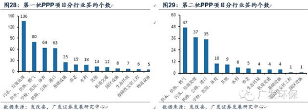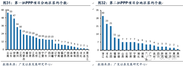 落地項目集中在市政、公共服務領域,占比約半數。從行業分布看,兩批簽約的項目主要集中在市政、公共服務及交通等領域,其中污水處理、公用事業等基建投資項目數占比約48%(兩批項目合計比例)?偣埠灱s的619個項目中,污水、垃圾處理項目173個,占28%;供水、供熱、燃氣等項目127個,占20%;鐵路、公路、港口等項目98個,占16%;學校、醫院、體育等項目74個,占12%。值得關注的是,第二批簽約項目中,學校、醫院、體育等項目僅有10個,比批減少了54個。這可能與地方財政收入有限,導致政府付費為主的PPP項目減少有關。