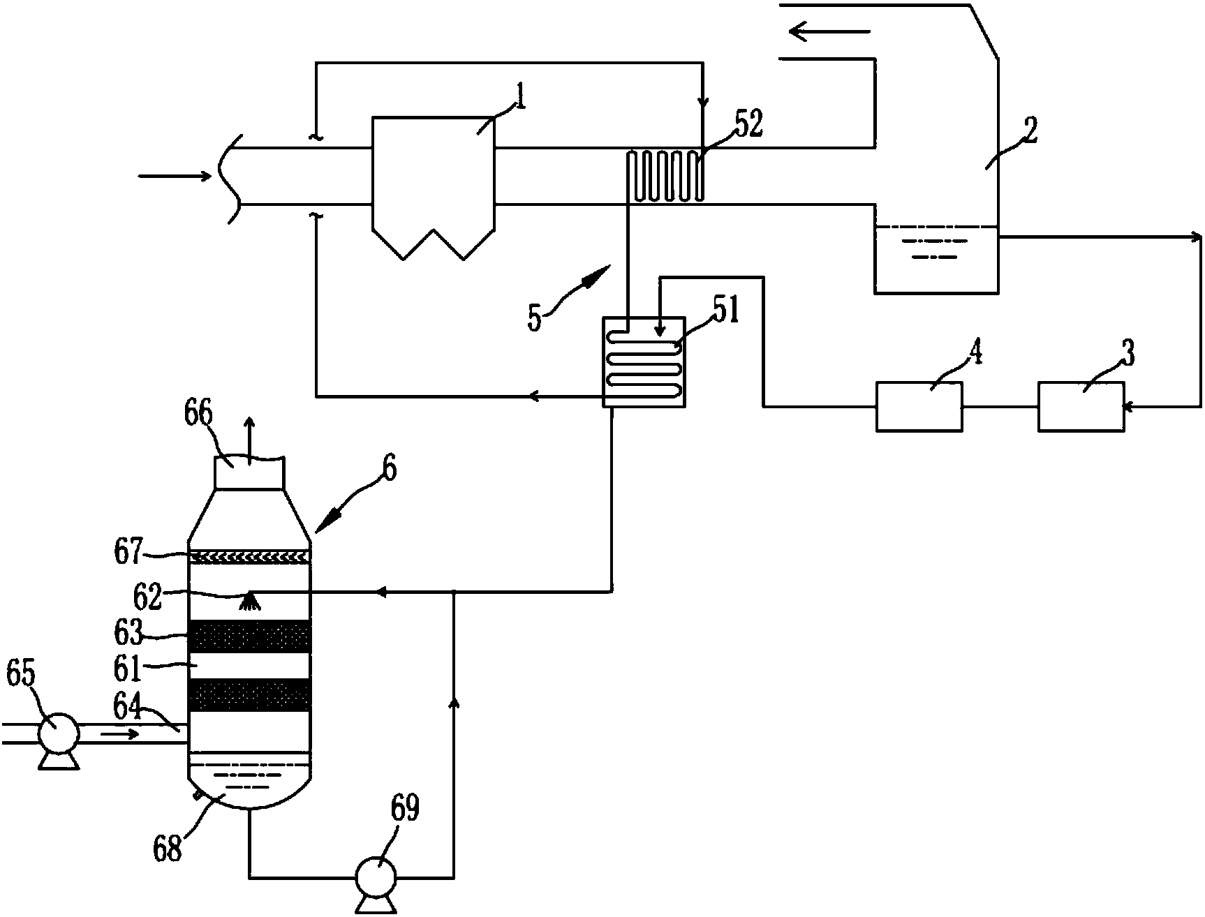 廢水預熱裝置(5),利用除塵器(1)與脫硫吸收塔(2)之間煙道內的煙氣熱量對預處理后的廢水進行預熱;