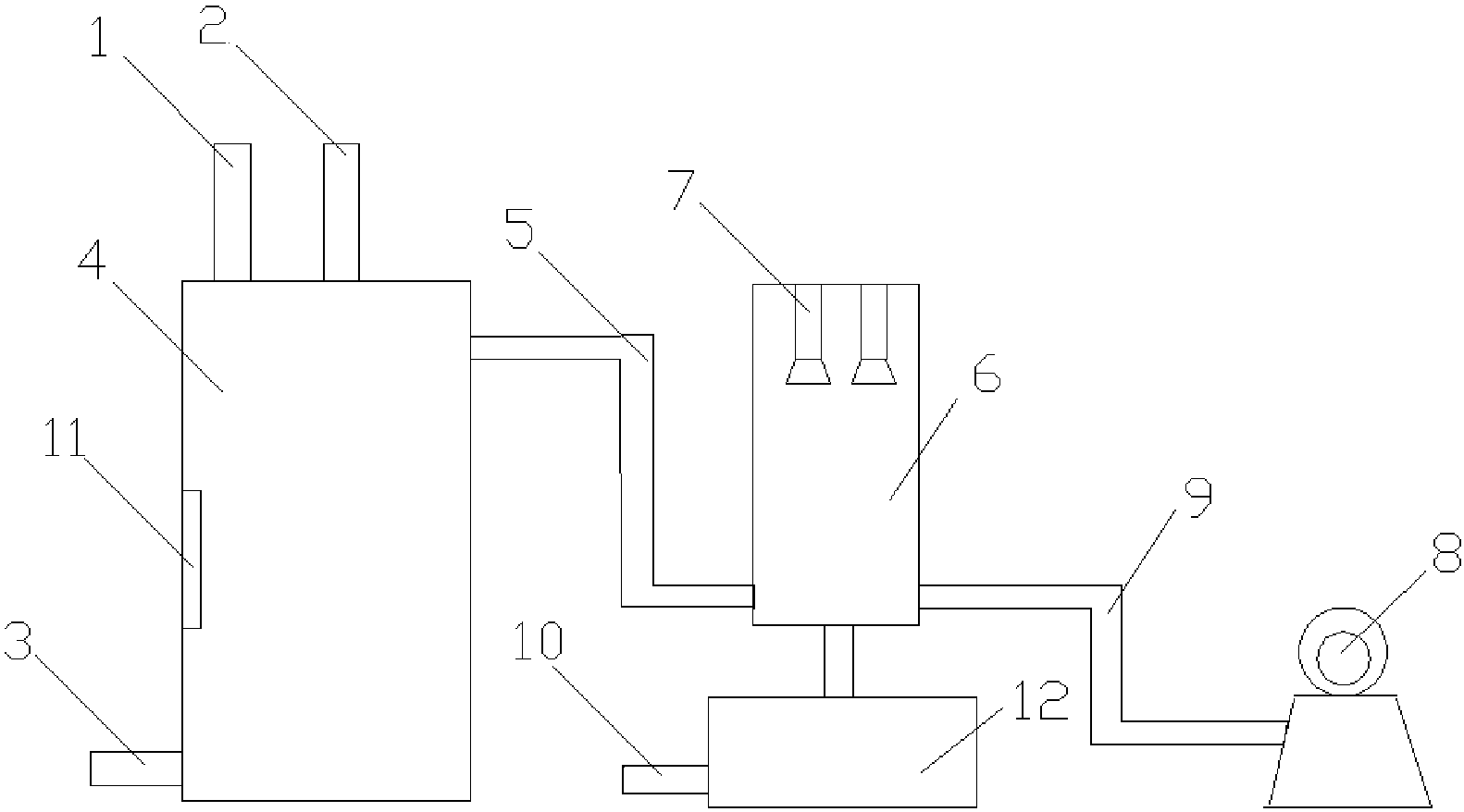 一種含氰廢水的回收設(shè)備,包括反應(yīng)釜4、吸收塔6、噴射器7、風(fēng)機(jī)8、吸收槽12,反應(yīng)釜4頂部設(shè)置母液進(jìn)液管1,底部設(shè)置廢液出液口3;管道5一端連接反應(yīng)釜4頂部,另一端連接在吸收塔6底部;吸收塔6塔內(nèi)上方設(shè)置噴射器7,吸收塔6下方設(shè)置進(jìn)風(fēng)管9;進(jìn)風(fēng)管9一端連接吸收塔6,另一端連接風(fēng)機(jī)8;吸收塔6底部設(shè)置吸收槽10,吸收槽12底部連接有排液管10。