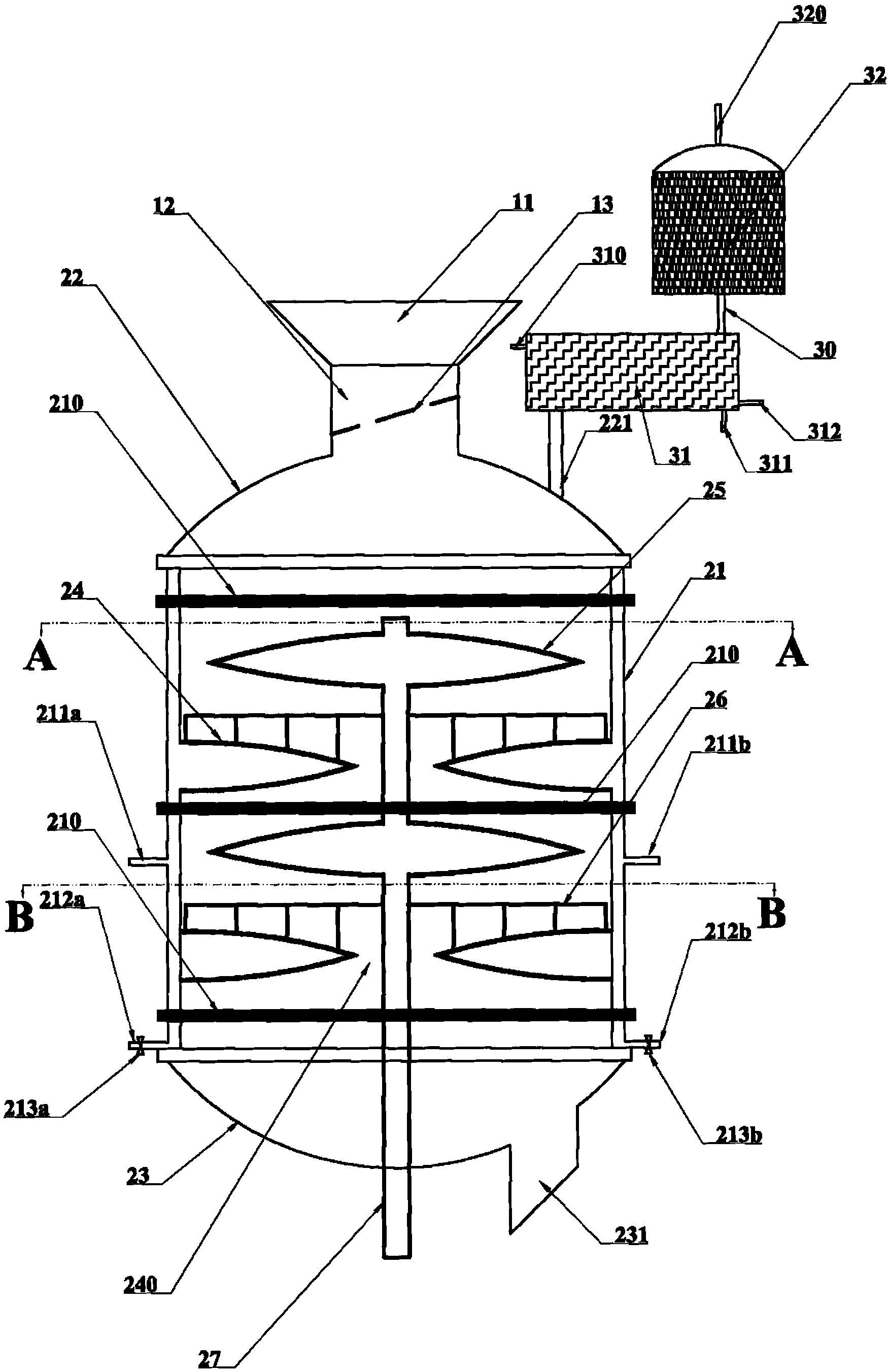 本實用新型通過以下技術方案來實現上述目的:一種用于污泥焚燒發電的干化預處理裝置,包括進料系統1、污泥干化筒2、空氣凈化系統3。所述的進料系統1由進泥口11、儲泥倉12組成。所述的污泥干化筒2由筒體21、上封頭22、下封頭23組成,所述的污泥干化筒中安裝有定盤24、動盤25、鈀齒26、旋轉軸27。所述的空氣凈化系統由冷凝器31和活性炭吸附柜32組成。所述的儲泥倉12上部設有所述的進泥口11,所述的儲泥倉12中設有振動篩13;所述的筒體21側壁設有蒸汽入口211a、第二蒸汽入口211b和冷凝水出管212a、第二冷凝水出管212b,所述的筒體21上中下均設有帶式管箍210;所述的上封頭22上以法蘭密封安裝有排氣管221;所述的儲泥倉12通過法蘭密封連接于所述的上封頭22的中心;所述的下封頭23底部中心設有出料口231;所述的上封頭22、下封頭23均以法蘭密封連接于筒體21上;所述的定盤24中心預留有卸料孔240;所述的冷凝水出管212a、第二冷凝水出管212b上設有電磁閥213a、第二電磁閥213b;所述的排氣管221通過螺紋連接于冷凝器31,冷凝器31通過管道30與活性炭吸附柜32連通,活性炭吸附柜32上設有放空管320,冷凝器31上設有冷凝水進水口310、冷凝水出水口311和冷凝水循環管312。