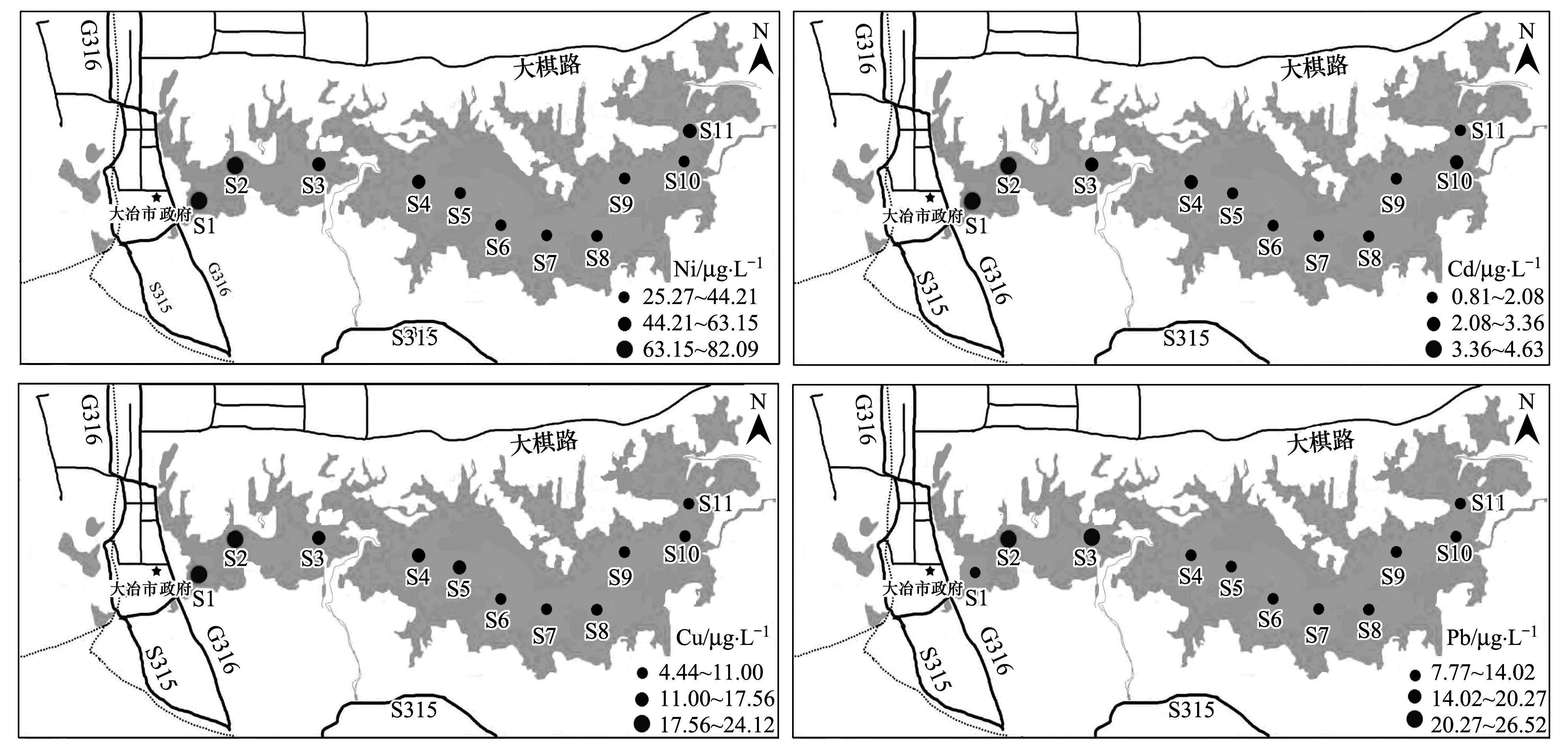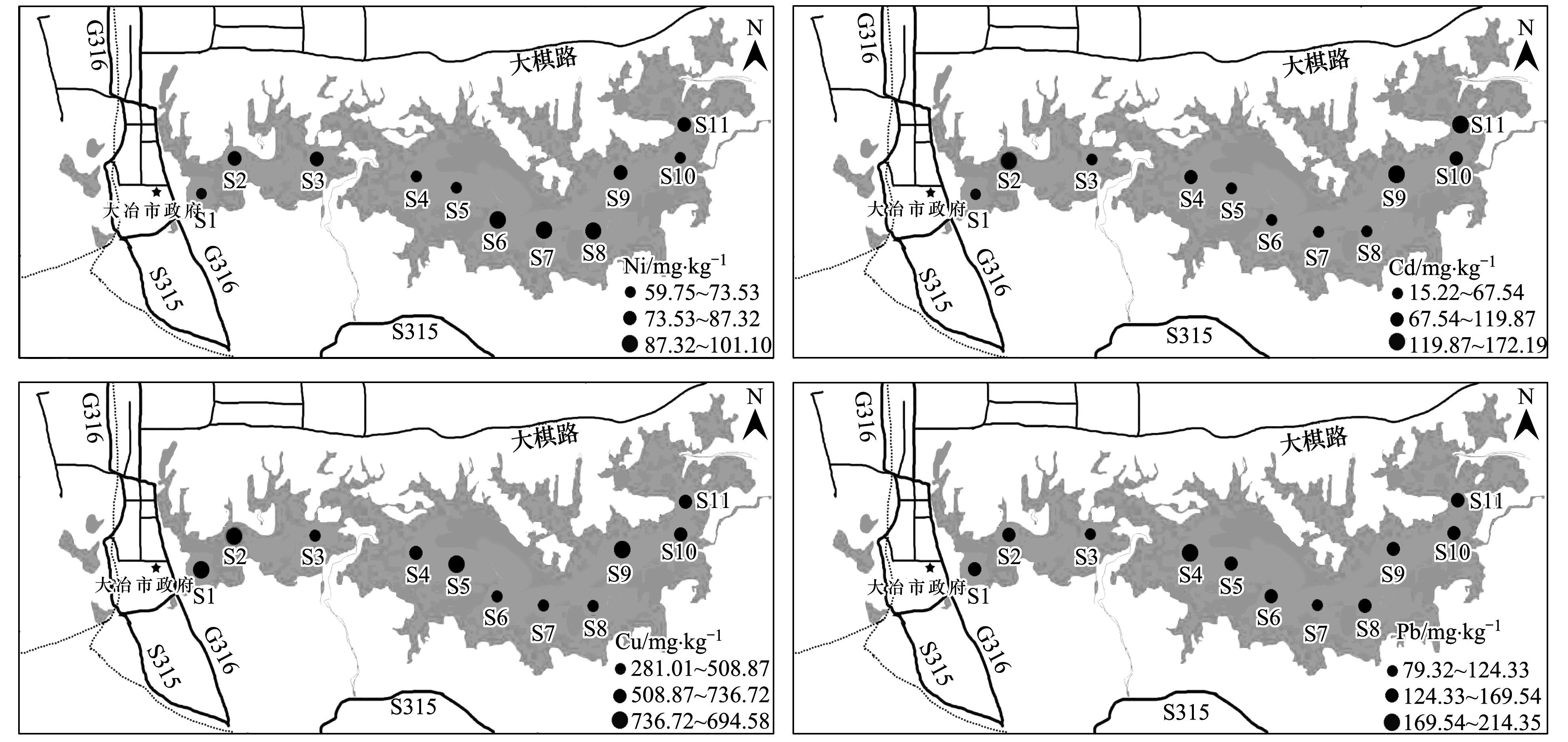 重金屬(Ni、Cd、Pb和Cu)元素污染分布特征表現(xiàn)為:大冶湖表層水和沉積物中重金屬元素污染主要分布在市政污水和工業(yè)廢水排污口較集中的湖灣區(qū)域, 而中部重金屬污染總體趨勢一致; 究其原因, 大冶湖湖灣(S1、S2和S11) 周邊分散著多家大型國有高污染礦冶企業(yè)以及大量“五小”(小選礦、小洗礦、小冶煉、小紅磚、小化工)企業(yè).此外, 大冶湖流域植被覆蓋率低, 山體裸露, 地質(zhì)災害時有發(fā)生, 水域面積不斷縮小, 人口數(shù)量不斷增加, 同樣也會直接導致大冶湖湖灣處重金屬污染更為嚴重.由于大冶湖是半封閉的水體, 流動性及與其他水體交換能力低; 大量重金屬污染物主要以懸浮物的形式, 通過各種途徑進入湖泊水體后, 隨著水流的搬運以及重力沉降作用, 比較終遷移至湖泊沉積物中, 導致大冶湖中部水體重金屬分布較均勻.