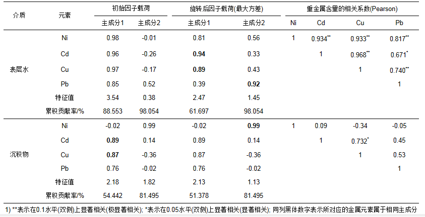 本研究使用SPSS 22.0統(tǒng)計分析軟件對大冶湖表層水和沉積物中重金屬元素(Ni、Cd、Cu和Pb)含量進行Pearson相關系數(shù)、主成分及其成分矩陣等多元統(tǒng)計分析, 結果如表 2所示.
