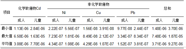 基于水環(huán)境健康風險評價模型及參數(shù), 計算出大冶湖水體中化學致癌物(Cd)和非致癌物(Ni、Cu和Pb)通過飲用途徑所致的個人年健康風險, 結果見表 3.