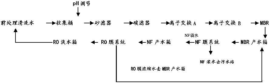 本發(fā)明的電鍍前處理廢水在線回用工藝將離子交換與MBR膜系統(tǒng)、NF膜系統(tǒng)、RO膜系統(tǒng)技術(shù)相結(jié)合,可實現(xiàn)廢水的循環(huán)使用,減少了新鮮水用量,達(dá)到減排的目的,在生產(chǎn)上的實際運(yùn)用的效果可以節(jié)省新鮮用水85%,更加環(huán)保,推廣價值較高。