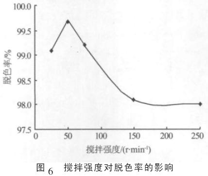 由圖6 可知,攪拌強度較小時,脫色率較高,攪拌強度在50 r/min 左右時,脫色效果比較好,攪拌強度超過150 r/min,脫色率明顯下降。實驗中亦觀察到在慢攪情況下,形成的絮體較大,沉降較快;快攪情況下,形成的絮體較小,沉降較慢,這是因為水力條件對絮凝與凝聚行為影響很大。但攪拌速度太小,復合絮凝劑未能與污染物充分接觸, 自然會影響脫色效果;攪拌速度過大,絮體易被打碎,影響絮團對污染物的架橋吸附及網捕作用,造成脫色率下降。具體參見污水寶商城資料或http://www.dowater.com更多相關技術文檔。