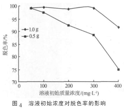 由圖4 可知, 復合絮凝劑投加質量為0.5 g 時,隨溶液初始濃度的增加,脫色率呈下降趨勢;當投加質量為1.0 g 時,在溶液初始質量濃度﹤300 mg/L 的范圍內均有95%以上的脫色率,溶液初始質量濃度超過300 mg/L 以后,脫色率顯著下降。這說明單位質量絮凝劑存在一比較大絮凝量, 超過此范圍處理效果下降。