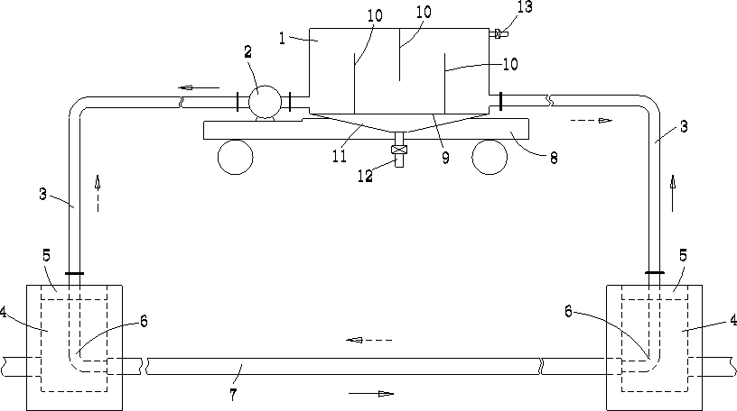 技術(shù)人員介紹,該系統(tǒng)包括盛放污水的箱體、排污泵、連接水管以及兩個(gè)軟性堵頭,排污泵通過(guò)連接水管與箱體相聯(lián)接,軟性堵頭設(shè)置在污水井中;在軟性堵頭中設(shè)置有彎管,彎管的一端與連接水管相通,其另一端與污水井的管道口相通;兩個(gè)軟性堵頭分別設(shè)置在相鄰的兩個(gè)污水井中,其另一端通過(guò)污水井的管道相通,一個(gè)軟性堵頭通過(guò)連接水管與排污泵相聯(lián)接,另一個(gè)軟性堵頭通過(guò)連接水管與箱體相聯(lián)接。