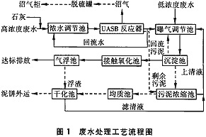 由車間排放的濃廢水自流至濃水調節池,調節pH后由污水泵提升至UASB反應器,出水一部分回流至濃水調節池,它與UASB反應器形成集調節、厭氧降解為一體的處理系統;一部分自流至曝氣調節池與淡廢水混合,經曝氣后由污水泵提升至沉淀池形成一級好氧系統;此時沉淀池出水已近達標,再自流至接觸氧化池、氣浮池進行好氧生化和物化處理(見圖1)。?