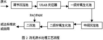 洗毛廢水是洗毛生產工藝排出的高濃度有機廢水,其中含有泥沙、羊毛脂、羊糞,還含有少量洗滌劑和羊毛纖維。經化驗分析證明:廢水中羊毛脂多已乳化,以O/W(水包油)形式存在,是組成廢水中BOD5,CODcr的主要成分。其色淡黃、味臭、粘稠、pH值為8.5~9.5,m(BOD5)/m(CODcr)為0.6左右。 根據以上廢水特點,采用厭氧、好氧加混凝沉淀的處理工藝。由于廢水中高濃度的CODcr,BOD5主要是由羊毛脂引起(該廠廢水中羊毛脂含量少,回收價值不大),羊毛脂的化學成分為脂肪酸和高級一元醇化合而成的脂。故先采用厭氧降解高分子物質,而后再用好氧生化,利用好氧微生物的新陳代謝作用去除水中的色度。氣味、粘稠物質等。考慮該公司管理水平,采用投資省、運行費用低。運行穩定的 UASB+二級生物接觸氧化法處理該廢水。 2.1 工藝流程 2.2.1 廢水處理工藝流程見圖2。